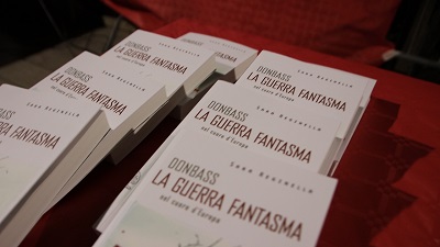 Sara, nel suo libro, racconta un conflitto “fantasma” in corso dal 2014 che ha provocato migliaia di vittime. Una guerra a tre passi da noi, in Europa, nel Donbass, in una regione sul confine russo-ucraino dove la popolazione civile combatte, muore e resiste! Dove le autoproclamatesi Repubbliche Popolari di Donetsk e Lugansk lottano per mantenere la propria dignità e la propria identità, ribellandosi a quello che viene inevitabilmente considerato un golpe filo nazista in Ucraina. “Donbass la guerra fantasma nel cuore d’Europa” è un reportage narrativo che parla del conflitto in essere sviluppandone la dimensione umana, che apre uno squarcio nel soffocante muro di gomma dei media mainstream, uno schiaffo che ci libera dal torpore della proposta virtuale e ci riporta alla realtà spingendoci a prenderne coscienza, ad alzare la testa e guardarci intorno, perché gli altri potremmo essere noi, perché in effetti lo siamo stati, e quella storia non deve ripetersi. Sara Reginella, psicoterapeuta e regista, oltre che scrittrice, ha risposto puntualmente alle tante domande del numeroso pubblico, che di tutte le fasce d’età, ha partecipato con grande interesse.